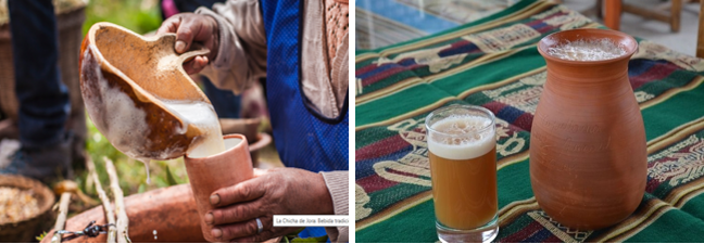 La “Chicha de Jora” es una bebida fermentada que principalmente se compone de maíz malteado (jora). La jora se obtiene enterrando el maíz en un saco en el suelo húmedo por unos 8 días, luego se pone al sol hasta secar bien y se procede a moler para obtener la harina que posteriormente se cocina con otros ingredientes y al enfriar se obtiene la deliciosa bebida.